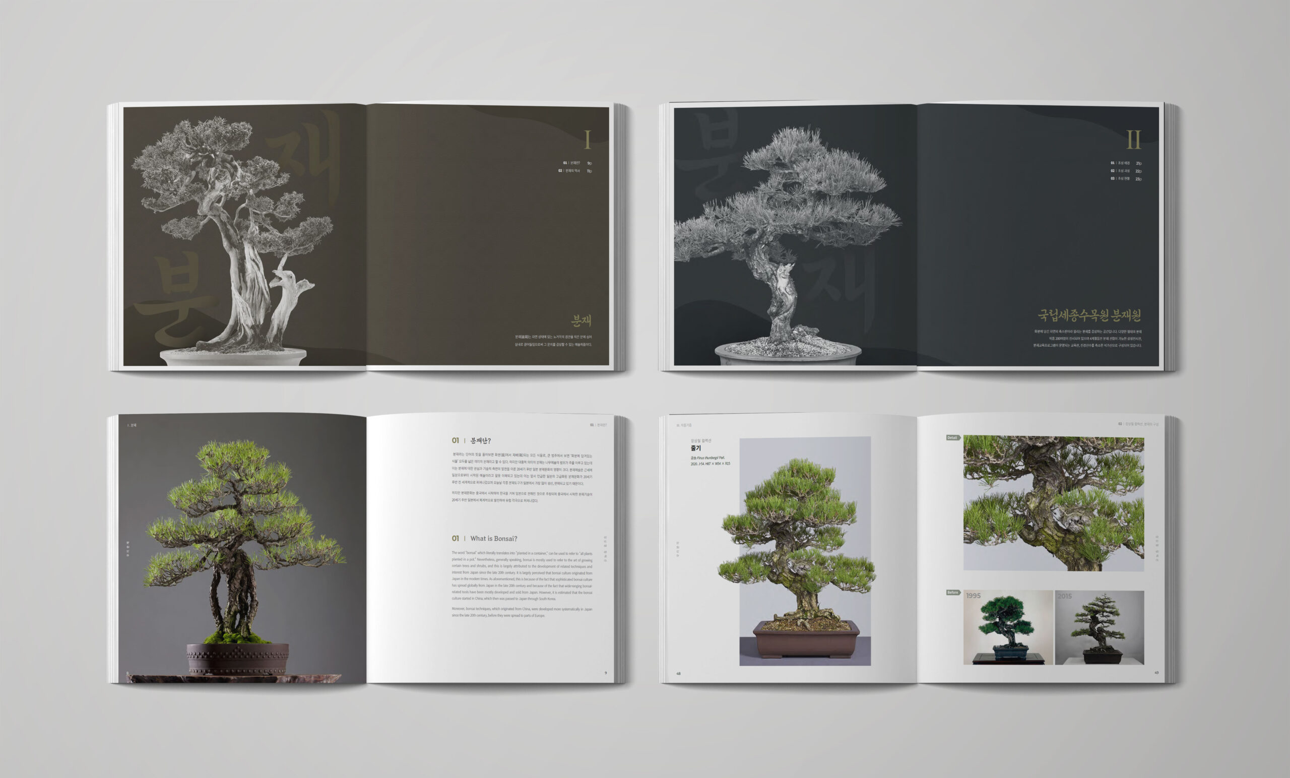 국립세종수목원에 전시되어 있는 분재에 대한 아카이브 축적 차원과, 우리 분재에 대한 인식제고를 위한 책자 입니다. 밋밋하지 않고 분재의 라인을 명확히 보이기 위해 메인사진은 모두 누끼를 따서 보다 감각적으로 편집 하였습니다. 누드제본으로 펼침성이 우수하며, 엔젤크로스 자석 케이스로 소장가치를 높인 프리미엄 책자 입니다.