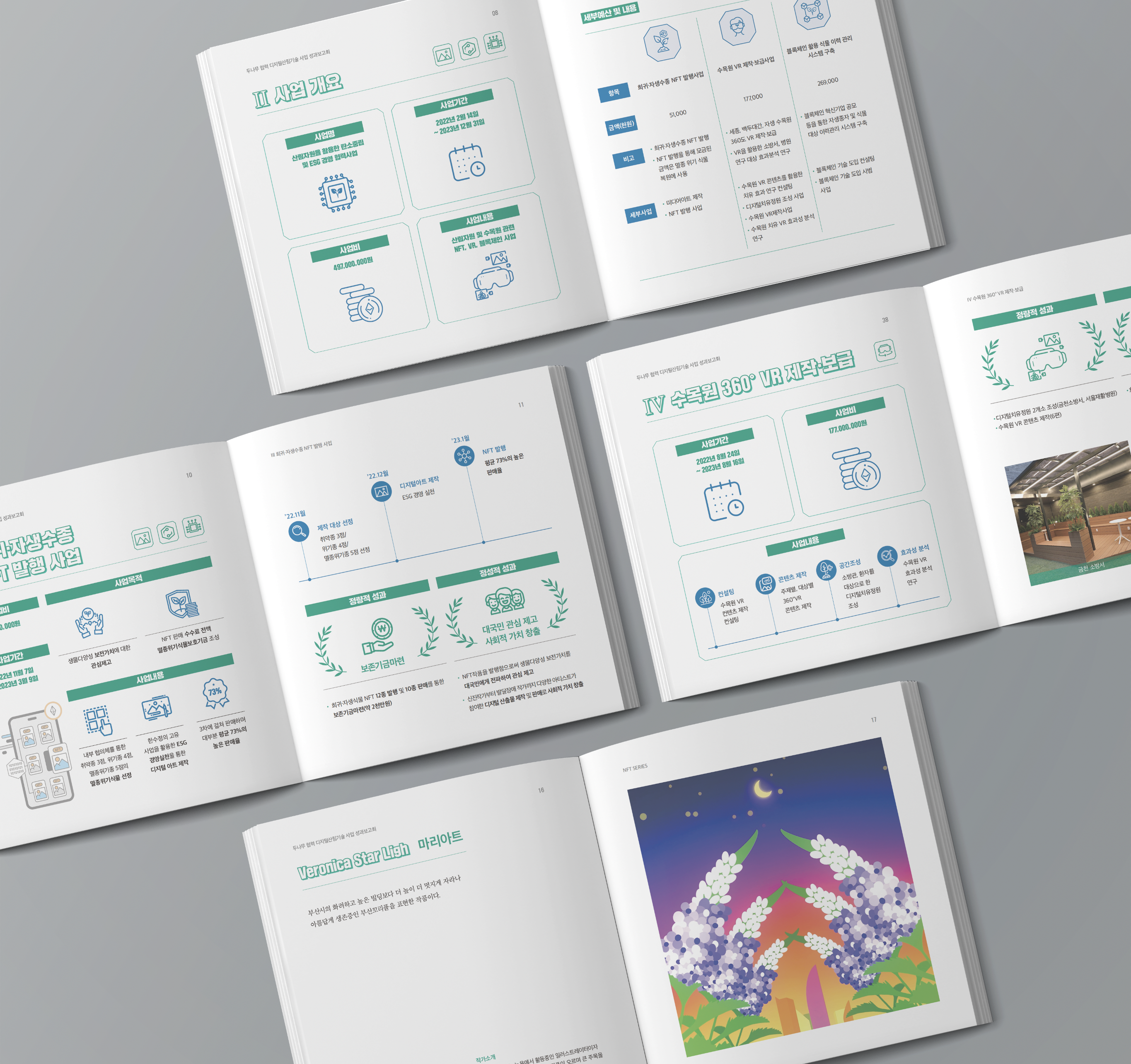 두나무와 한국수목원정원관리원이 협력하여 진행했던 디지털산림기술사업의 최종 보고서입니다. 적은 내용의 텍스트를 인포그래픽화 하여 시각적으로 채움과 동시에 정보전달에 중점을 두었습니다. NFT 소개 부분은 화보집 개념으로 깔끔하게 편집하였습니다.