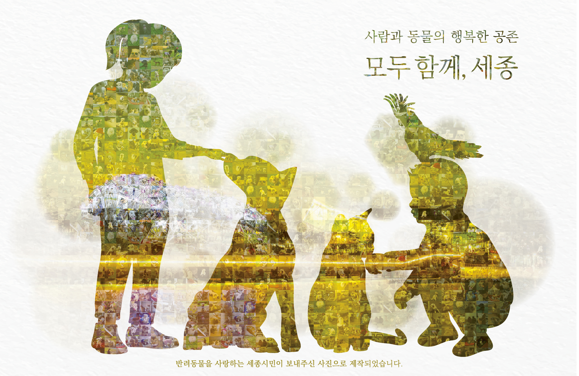 반려동물을 기르는 세종시민의 사진을 공모받아 세종호수공원에 시범적으로 설치한 벽화의 디자인을 전개하였습니다. 전체 아웃라인으로 반려동물과 함께하는 시민의 모습을 시각화하였고, 세종호수공원의 전체 이미지에 세종시민의 사진을 모자이크로 배치하여 상징성을 드러낸 디자인 입니다.