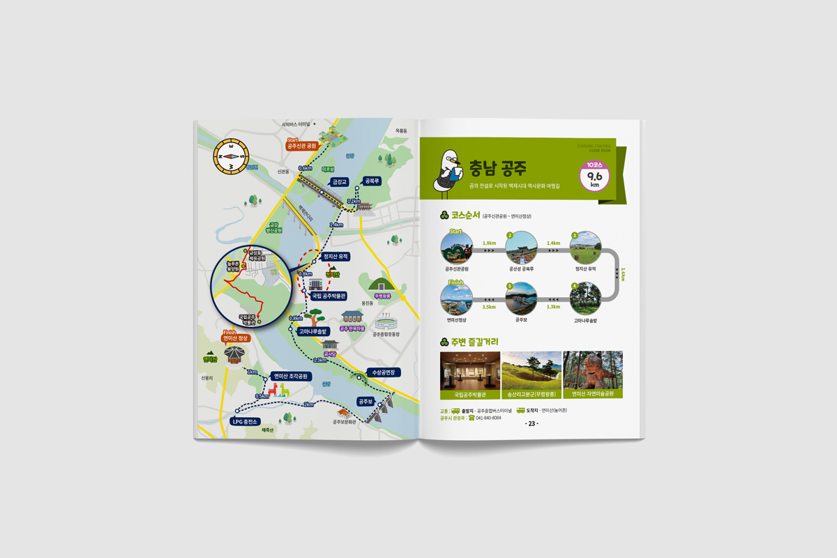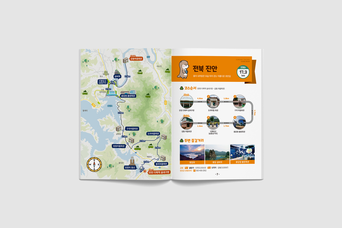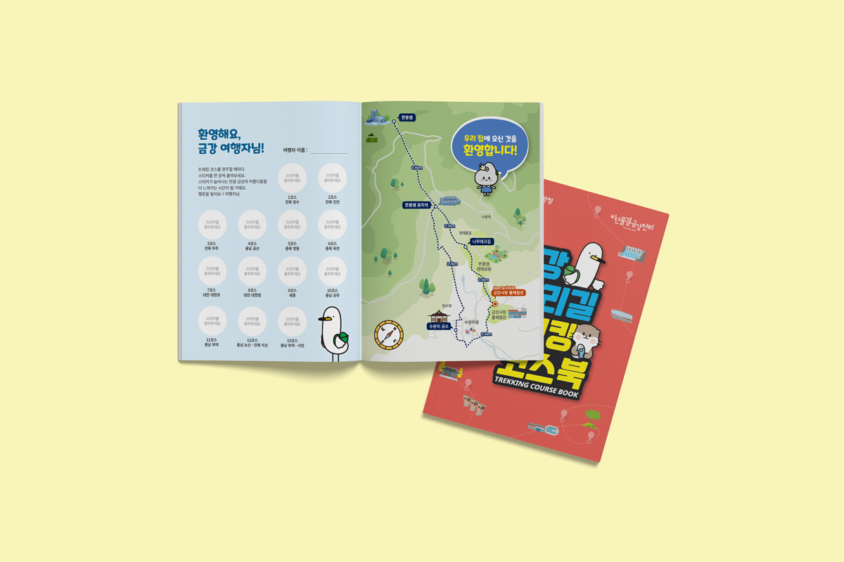 금강유역환경청이 관리하는 트레킹 코스를 시각화한 코스북 입니다. 해당 지역, 위치, 코스에 대한 충분한 이해도를 바탕으로 지도를 그리고 랜드마크의 아이콘화를 통해 시각적 재미를 주었습니다. 작은 사이즈의 핸드북으로 휴대하기 용이하게 제작하였습니다.