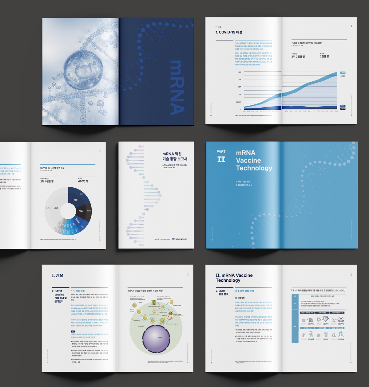 mRNA 백신 기술동향 보고서로 도표 등 인포그래픽 작업과 저해상의 삽화를 고해상으로 다시 그리는 작업을 통해 정보 전달성을 높였습니다. 표지는 홀로그램박을 활용하여 mRNA 구조를 임팩트 있게 효과적으로 표현하였습니다.
